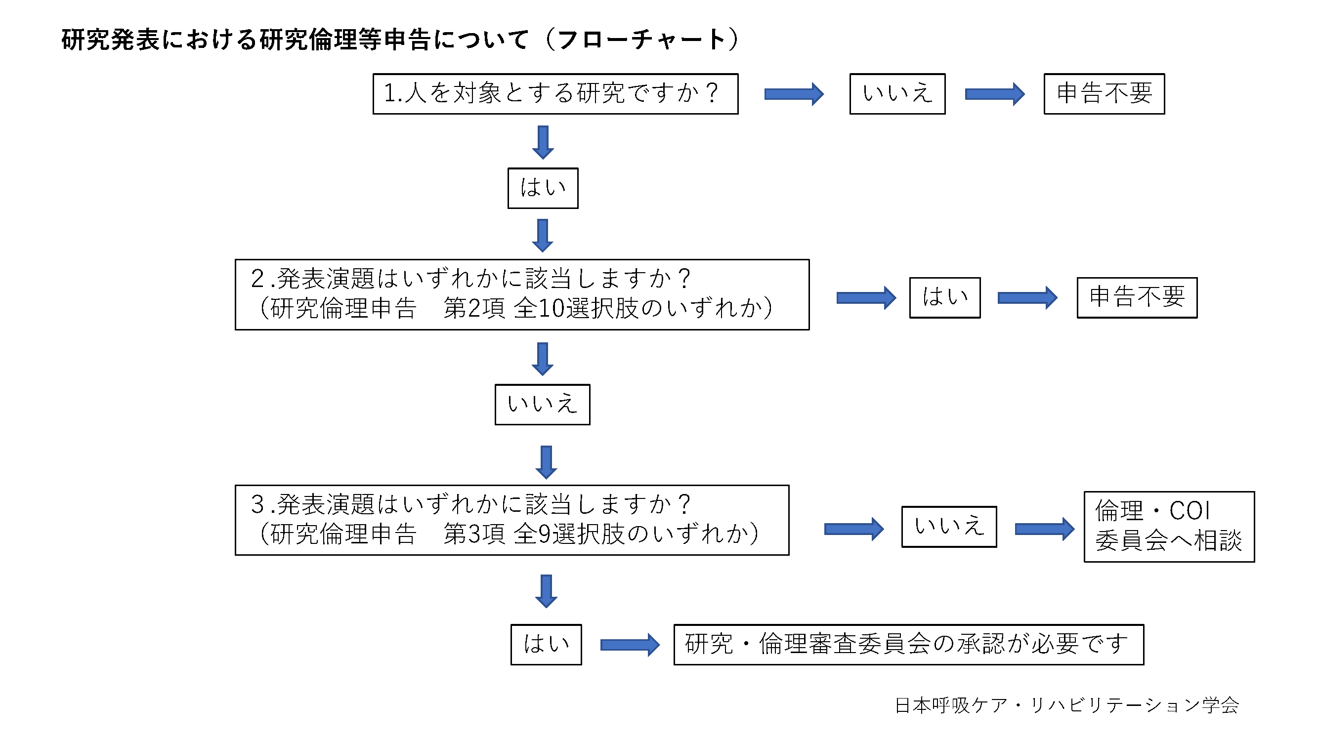▷ ページを更新する日本呼吸ケア・リハビリテーション学会では、発表演題について、研究・倫理に関する規範に基づいて適切に審査を受けていることを申告いただくことになります。報告・研究の内容によっては、施設の倫理審査会等での審議承認は不要ですが、研究倫理申告が必要な場合がありますのでご留意ください。用語に関しては「人を対象とする生命科学・医学系研究に関する倫理指針」(令和3年3月23日公布)をご参照ください。申告にあたりまして別記載のフローチャートで要否をご確認ください。